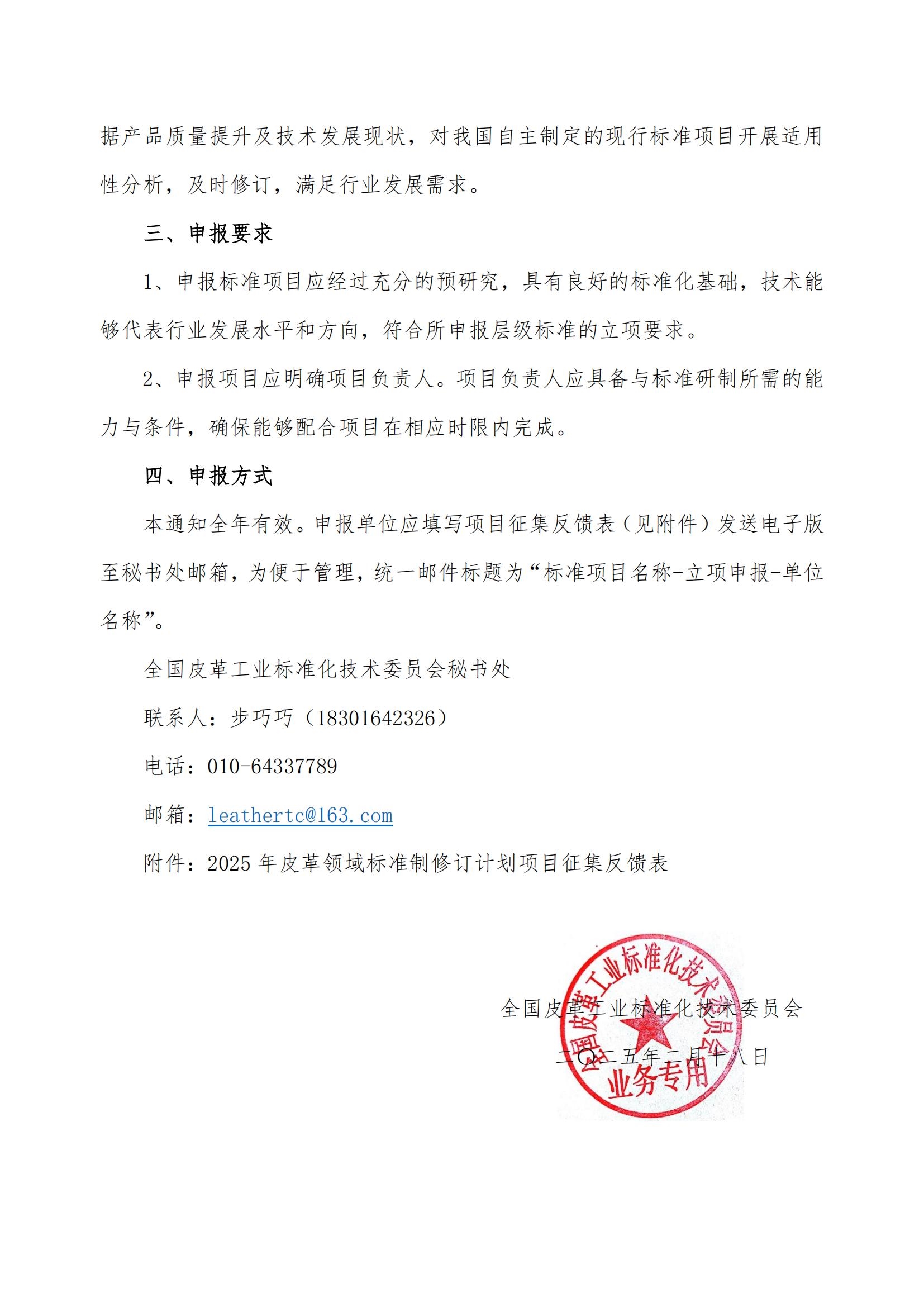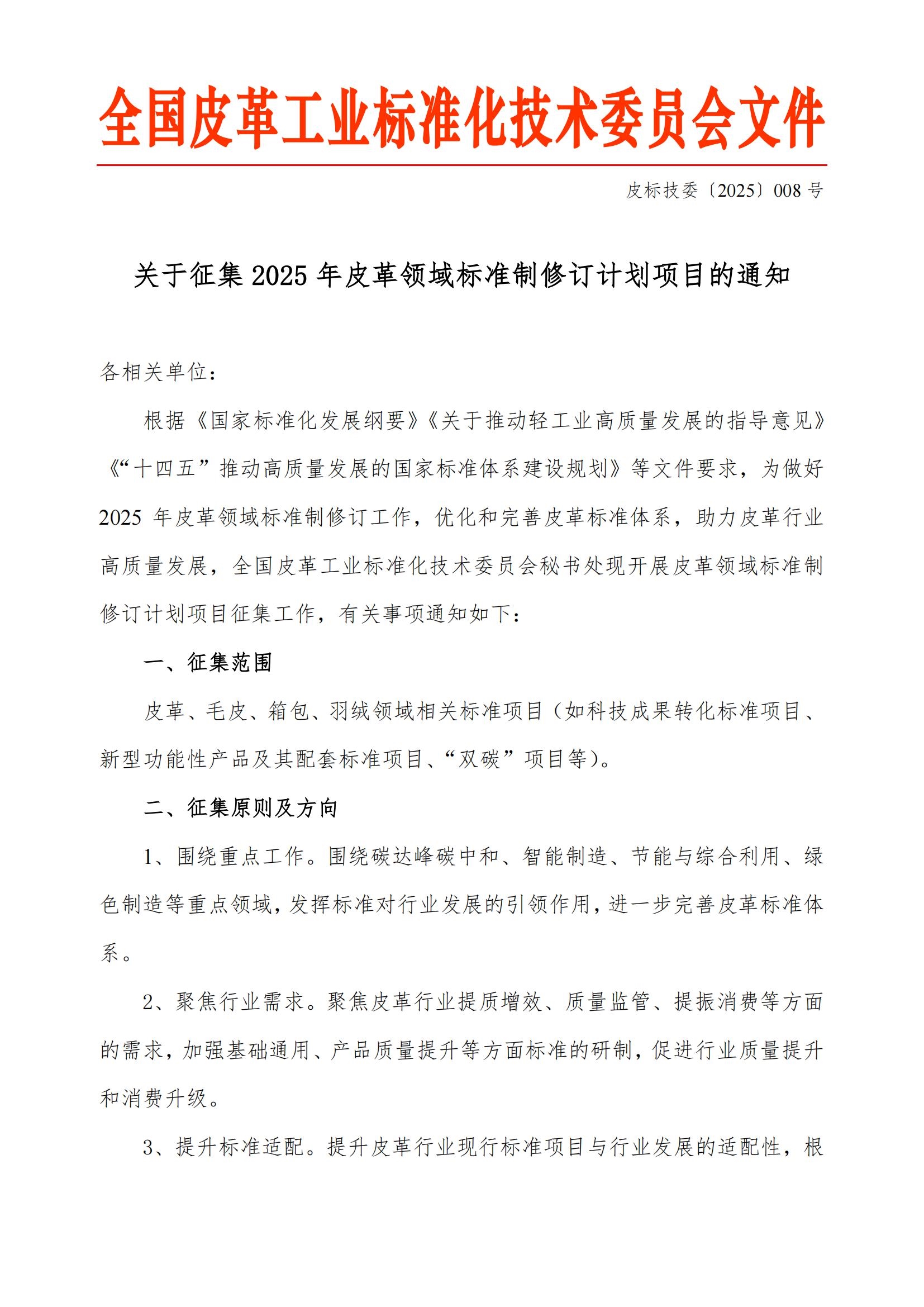 关于征集 2025 年皮革领域标准制修订计划项目的通知