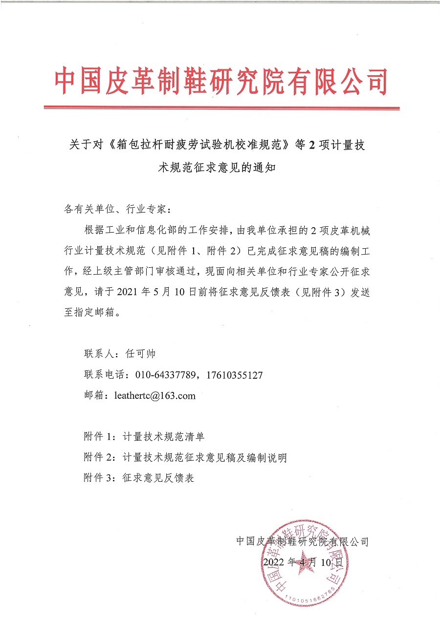 1.关于对《箱包拉杆耐疲劳试验机校准规范》等2项计量技术校准规范征求意见的通知