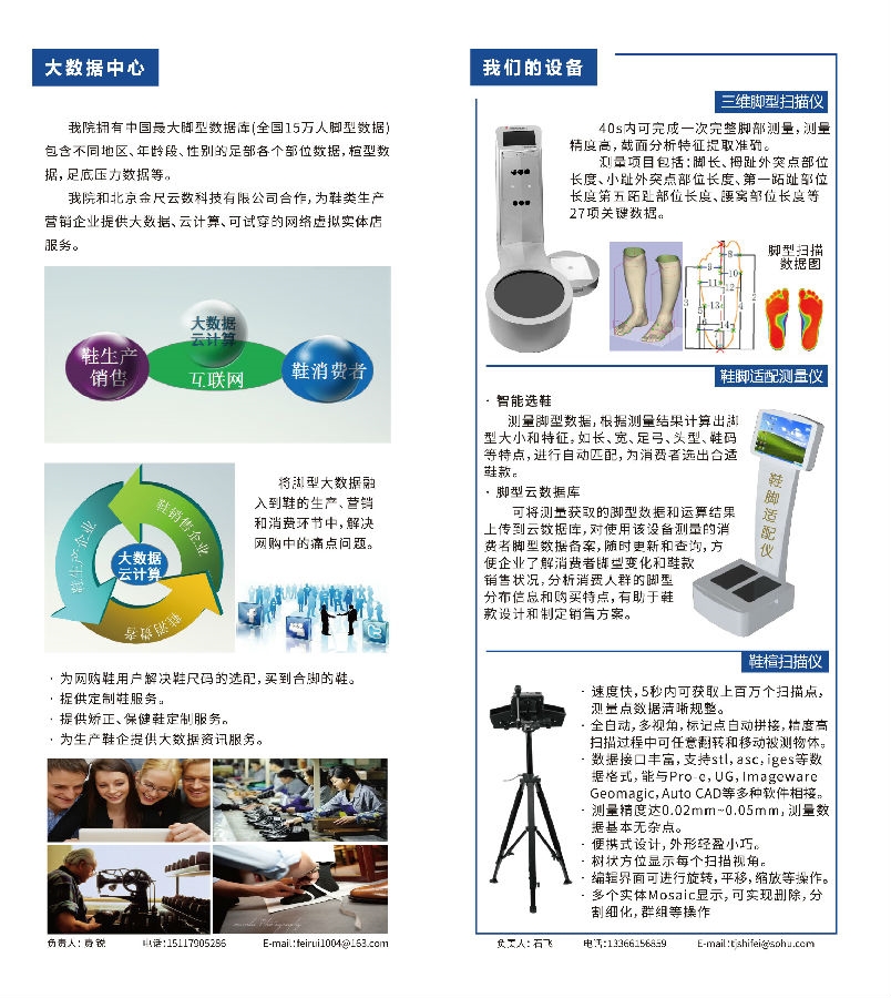 脚型数据与足履适配联合实验室为中国皮革和制鞋工业研究院与北京金尺云数科技有限公司联合成立。实验室通过海量采集中国人脚型三维数据及足底压力数据,并进行分析、处理,形成服务于行业的大数据平台。在大数据和足履适配的研究基础上,为传统的鞋类生产、销售企业提供第三方服务;为购鞋者、鞋类生产、销售厂家解决生产、流通和买卖之间的痛点问题,并提供大数据支持服务。