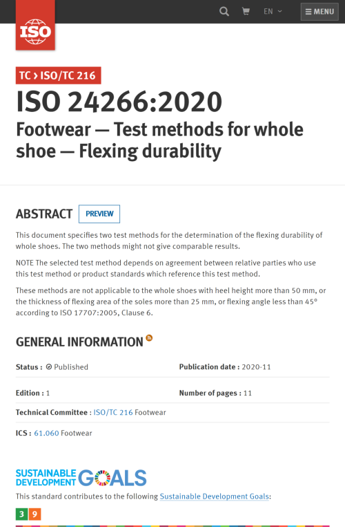 2020年11月,中国和西班牙联合主导制定的国际标准ISO 24266:2020 Footwear — Test methods for whole shoe — Flexing durability《鞋类 整鞋试验方法 耐折性能》由国际标准化组织(ISO)正式发布,这是第1项中国主导制定的整鞋试验方法国际标准,也是我国在ISO框架下制定的第6项鞋类国际标准。