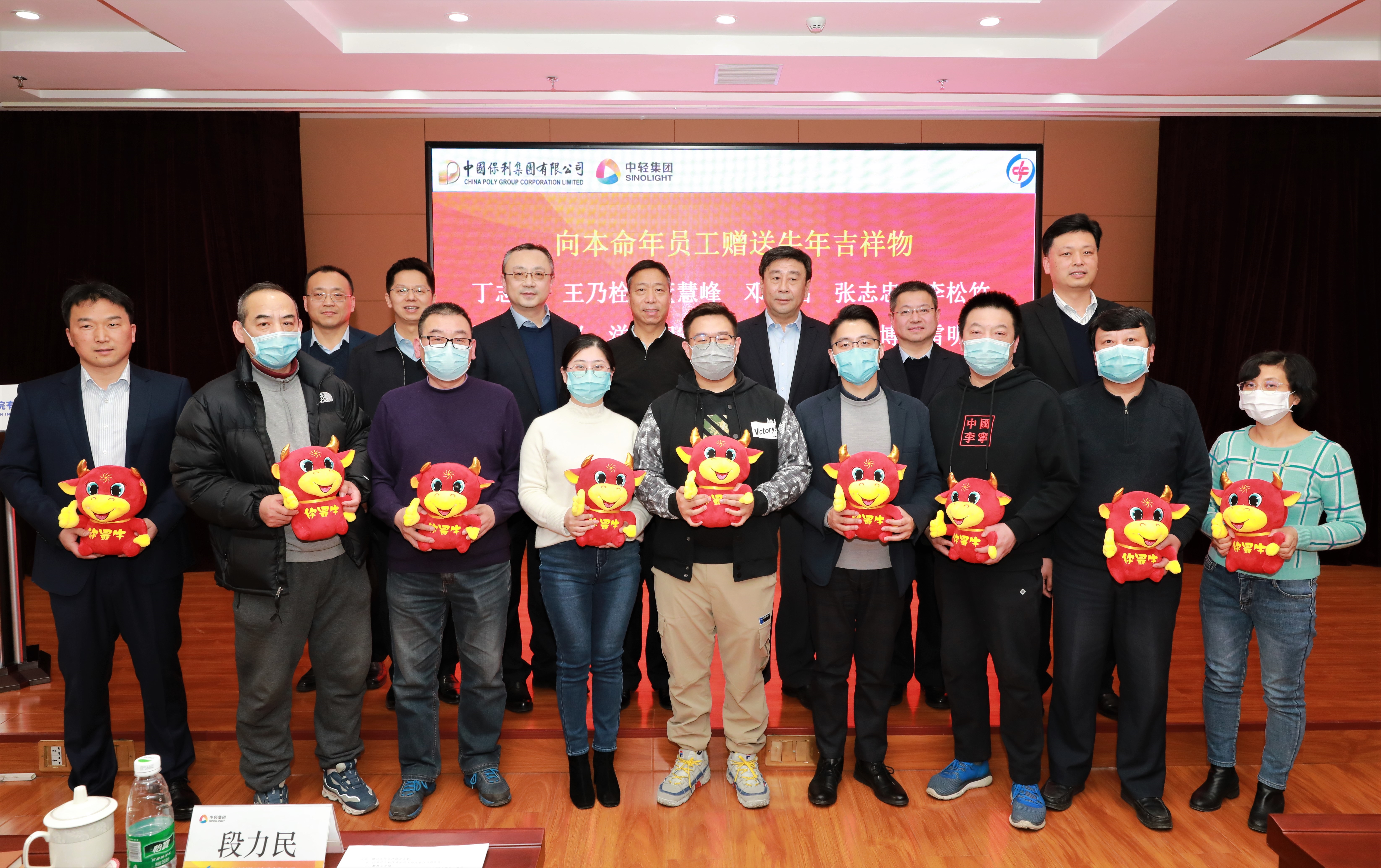 ▲与会领导为本命年员工贴心送上牛年生肖吉祥物。
