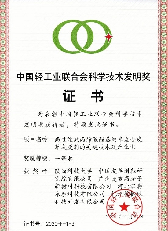 2021年7月18日,中国轻工业联合会第五次会员代表大会暨中华全国手工业合作总社第八次代表大会在北京召开,会上举行了2020年度中国轻工业联合会科学技术奖颁奖仪式。中国皮革制鞋研究院参与的《高性能聚丙烯酸酯基纳米复合皮革成膜剂的关键技术及产业化》项目荣获2020年度中国轻工业联合会科学技术发明一等奖。