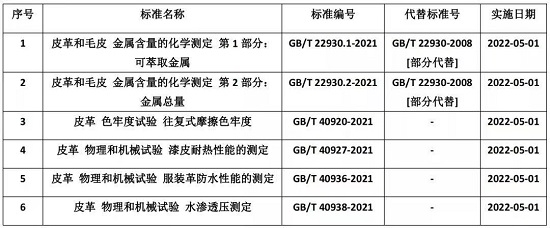 <span style="color: rgb(62, 62, 62); font-family: -apple-system, BlinkMacSystemFont, " helvetica="" neue",="" "pingfang="" sc",="" "hiragino="" sans="" gb",="" "microsoft="" yahei="" ui",="" yahei",="" arial,="" sans-serif;="" font-size:="" 16px;="" letter-spacing:="" 0.544px;="" text-align:="" justify;"="">2021年10月11日,国家市场监督管理总局(国家标准化管理委员会)发布2021年第12号中国国家标准公告,批准发布了602项国家标准和1项国家标准修改单。由全国皮革工业标准化技术委员会归口管理的6项皮革领域国家标准和全国制鞋标准化技术委员会归口管理的5项制鞋领域国家标准正式发布,具体标准信息如下表所示。