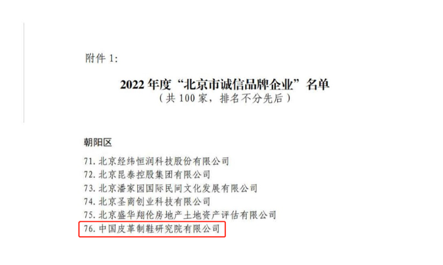 近日,首都文明网公布了《关于命名2022年度“百业万企”共铸诚信文明北京活动先进典型的通报》,共100家企业获得“北京市诚信品牌企业”荣誉称号,中国皮革制鞋研究院榜上有名。