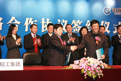 2月1日,中国轻工集团公司与中国建设银行股份有限公司北京市分行50亿元战略合作协议签约仪式在北京隆重举行,集团公司总经理陈鄂生、建行北京分行行长王军分别代表各自企业出席仪式并签署了战略合作协议。双方还将在资金结算、资金管理平台、财务顾问服务以及其他金融服务等方面深化合作,这标志着双方的合作将迈上更高的台阶。集团公司副总经理俞海星、集团公司总会计师郭建全以及建行北京分行副行长龚毅、宣武支行行长刘发猛出席签约仪式。