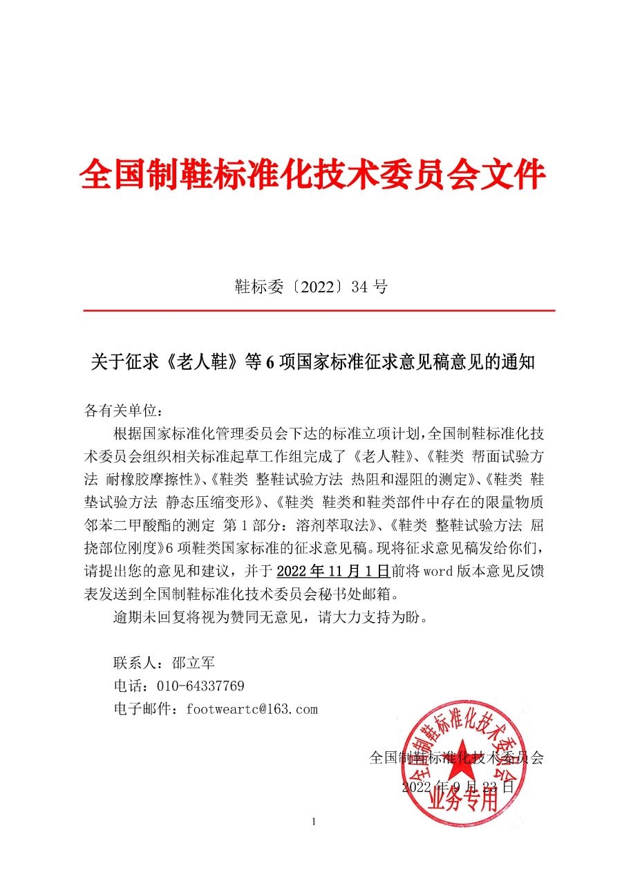 关于征求《老人鞋》等6项国家标准征求意见稿意见的通知