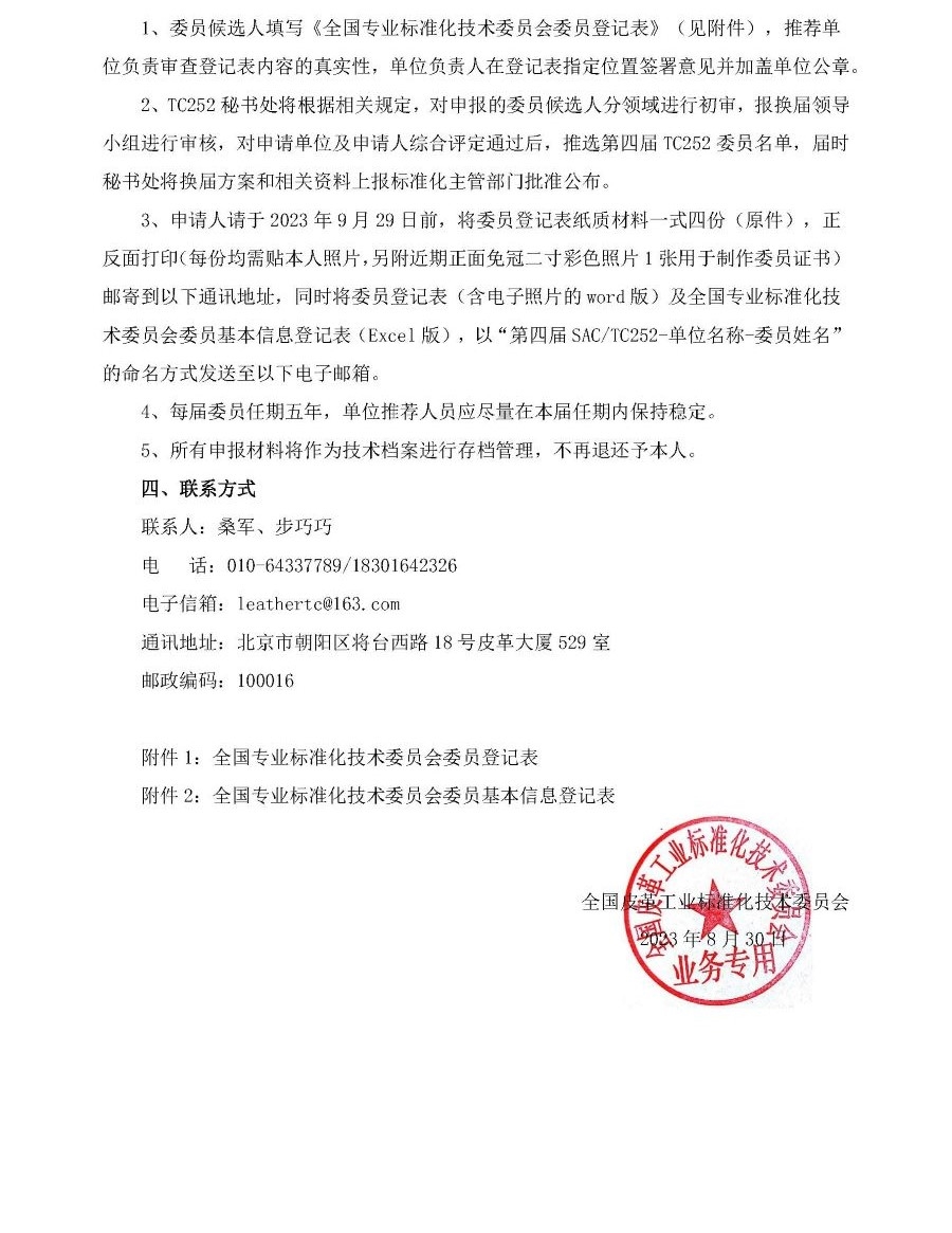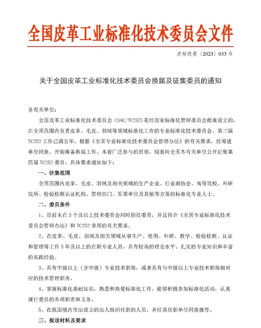 关于全国皮革工业标准化技术委员会换届及征集委员的通知