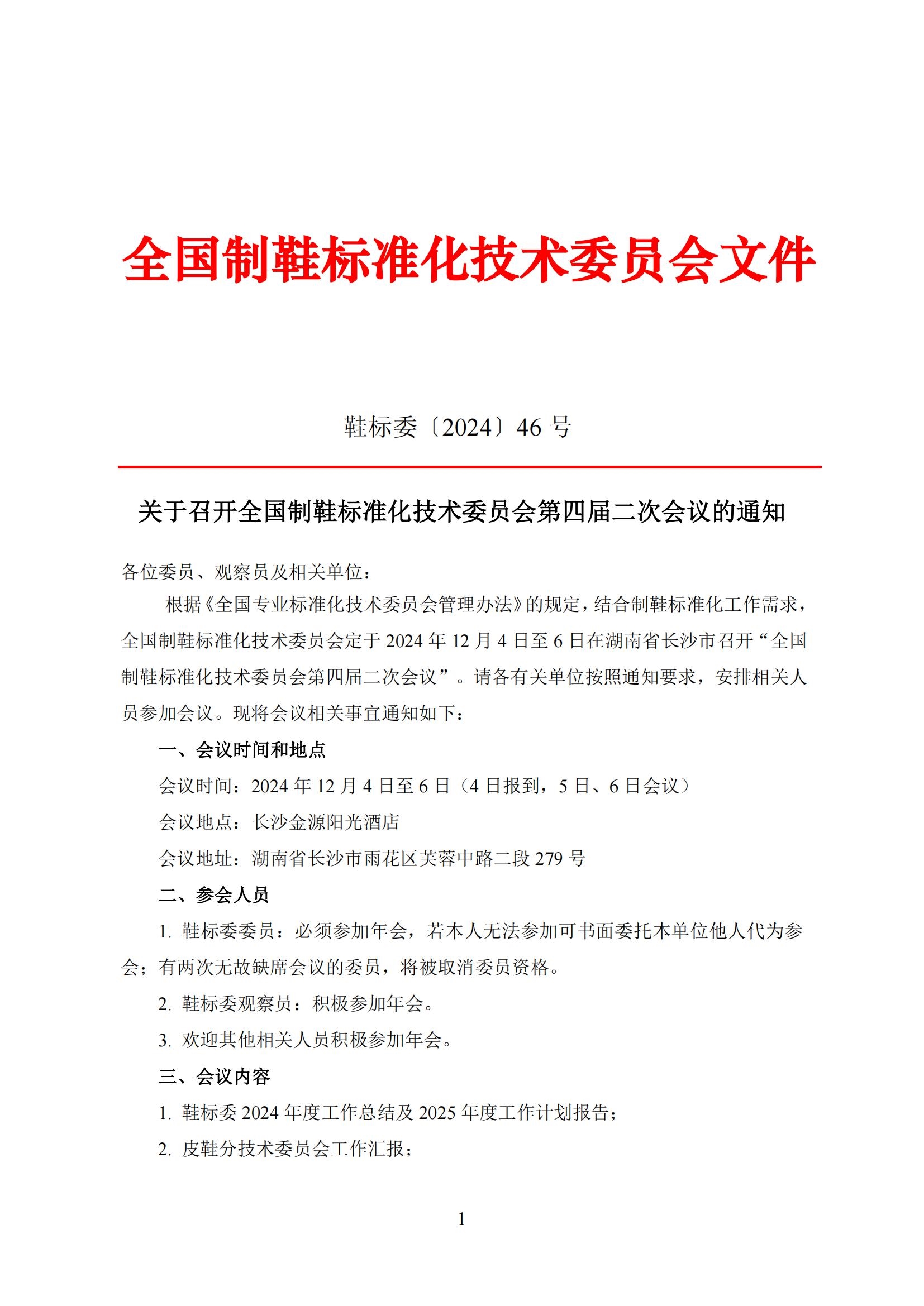 关于召开全国制鞋标准化技术委员会第四届二次会议的通知