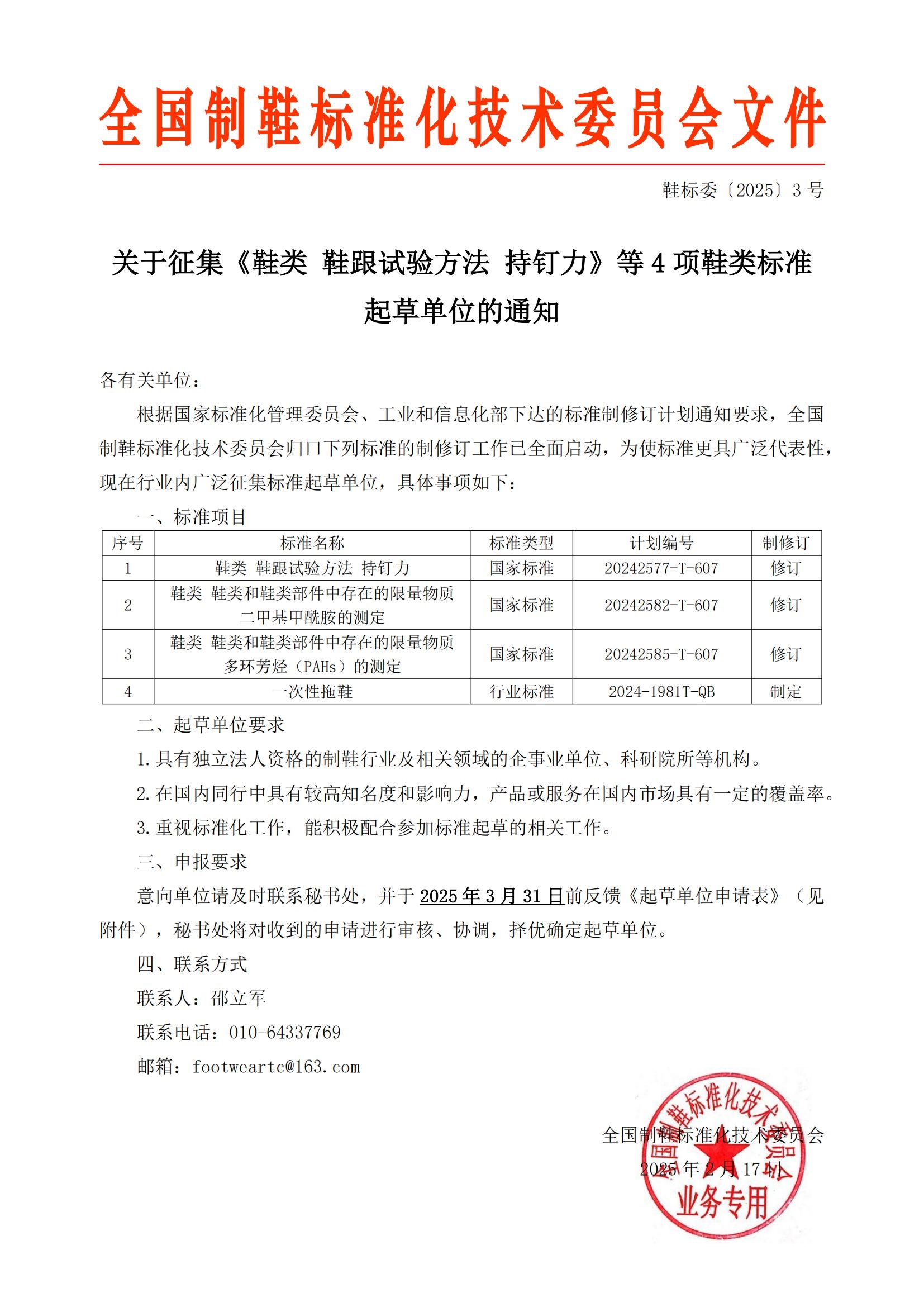 关于征集《鞋类 鞋跟试验方法 持钉力》等 4 项鞋类标准 起草单位的通知